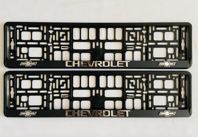 Set of Chevrolet Motors number plate holder surrounds. Raised 3D embossed finished in premium silver foil. Enhance your number plates look with a more cleaner, sharper finish. Front and rear
