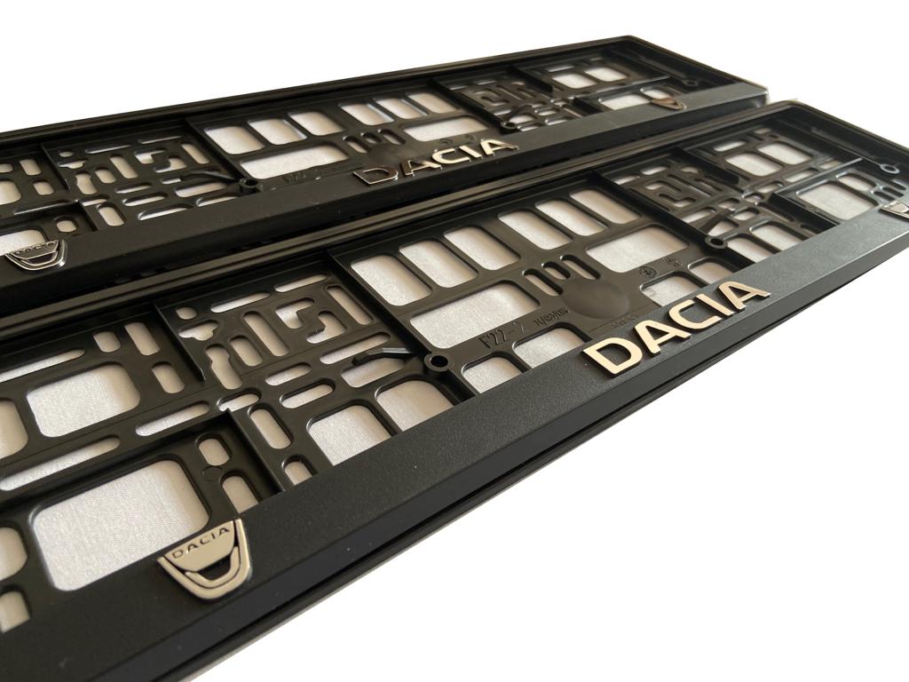 Set of Dacia Motors number plate holder surrounds. Raised 3D embossed finished in premium silver foil. Enhance your number plates look with a more cleaner, sharper finish. Front and rear