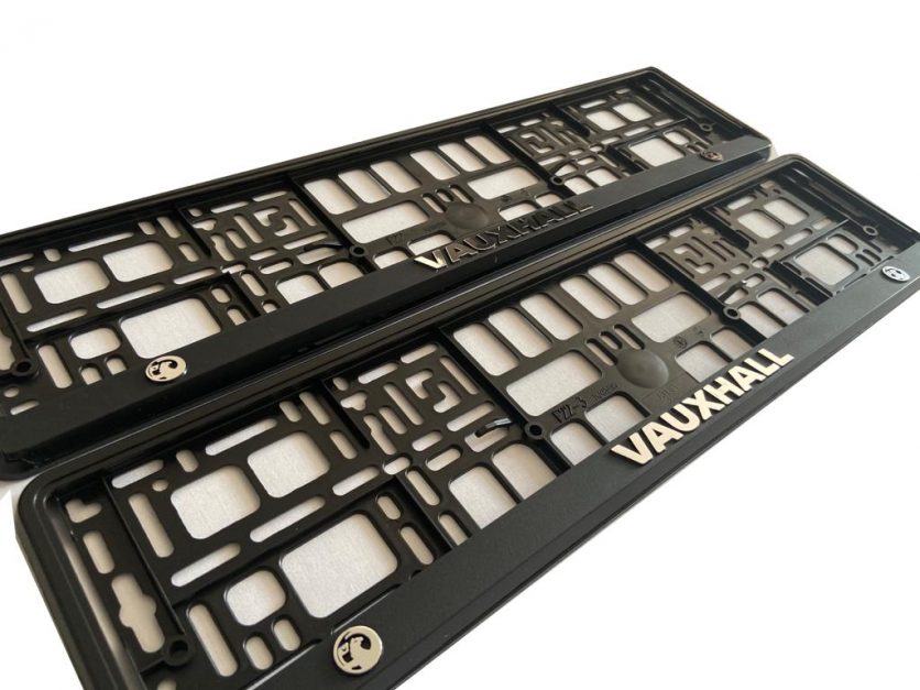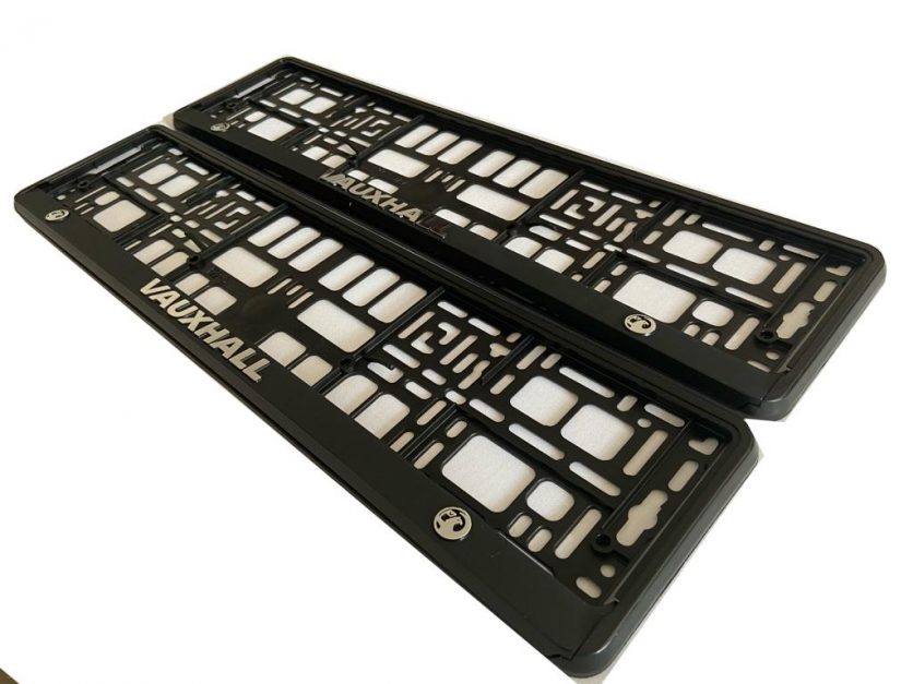 Set of vauhall number plate holder surrounds. Raised 3d embossed finished in premium silver foil. Enhance your number plates look with a more cleaner, sharper finish. Front and rear.