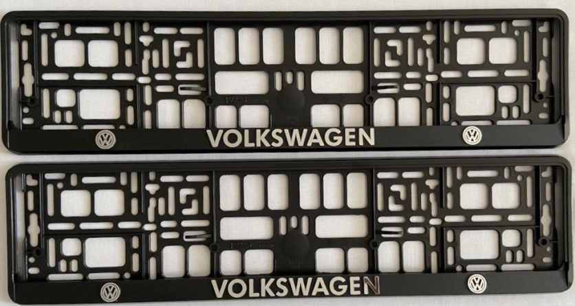 SET OF VOLKSWAGEN NUMBER PLATE HOLDER SURROUNDS. RAISED 3D EMBOSSED FINISHED IN PREMIUM SILVER FOIL. ENHANCE YOUR NUMBER PLATES LOOK WITH A MORE CLEANER, SHARPER FINISH. FRONT AND REAR.